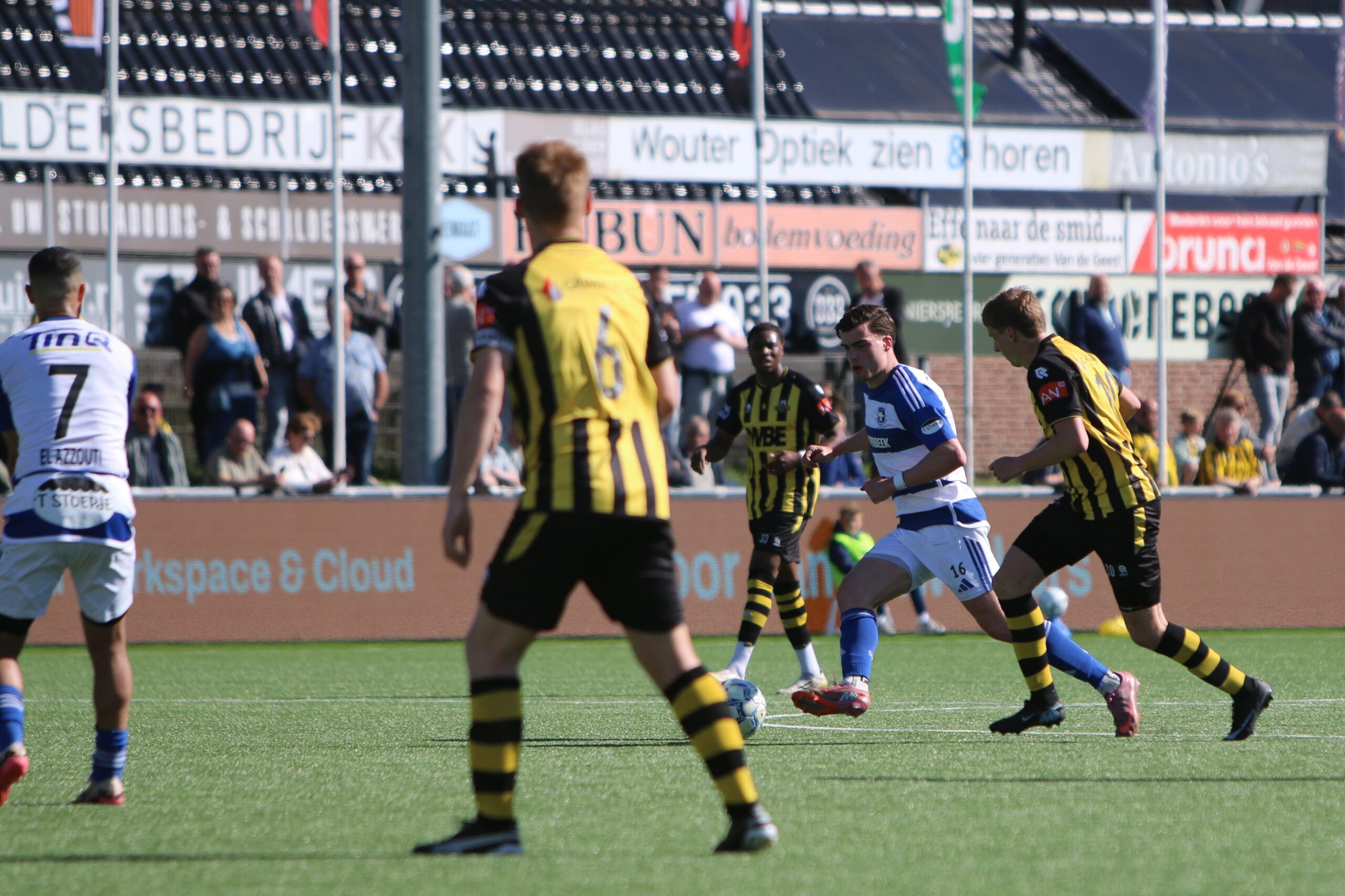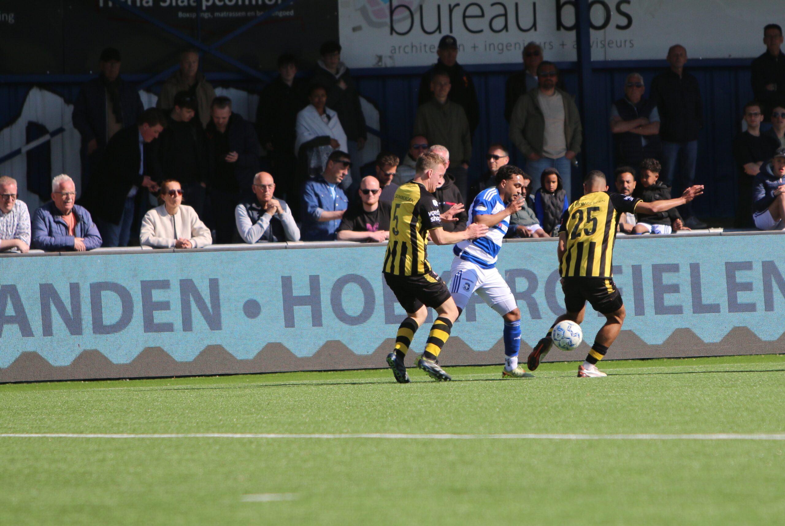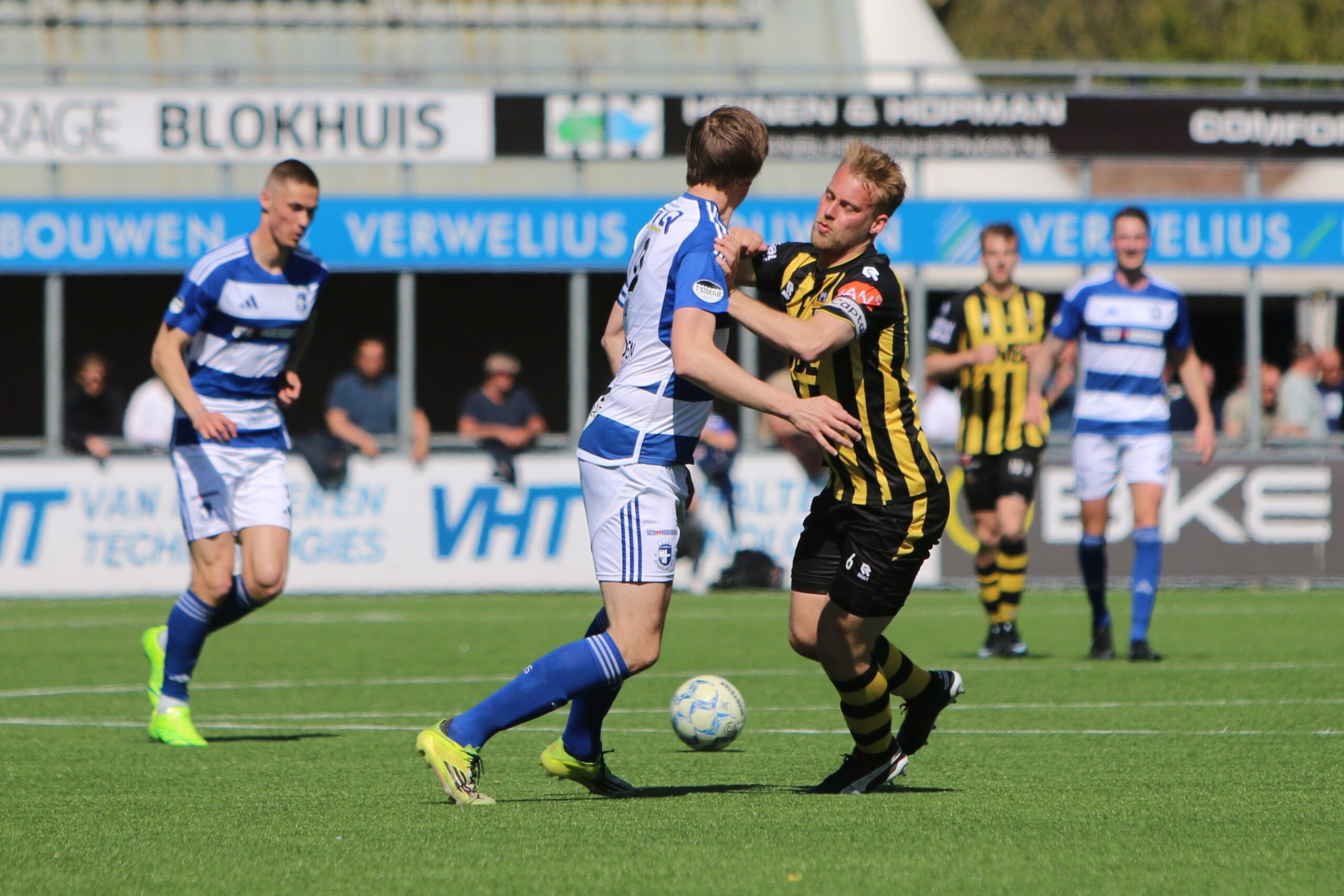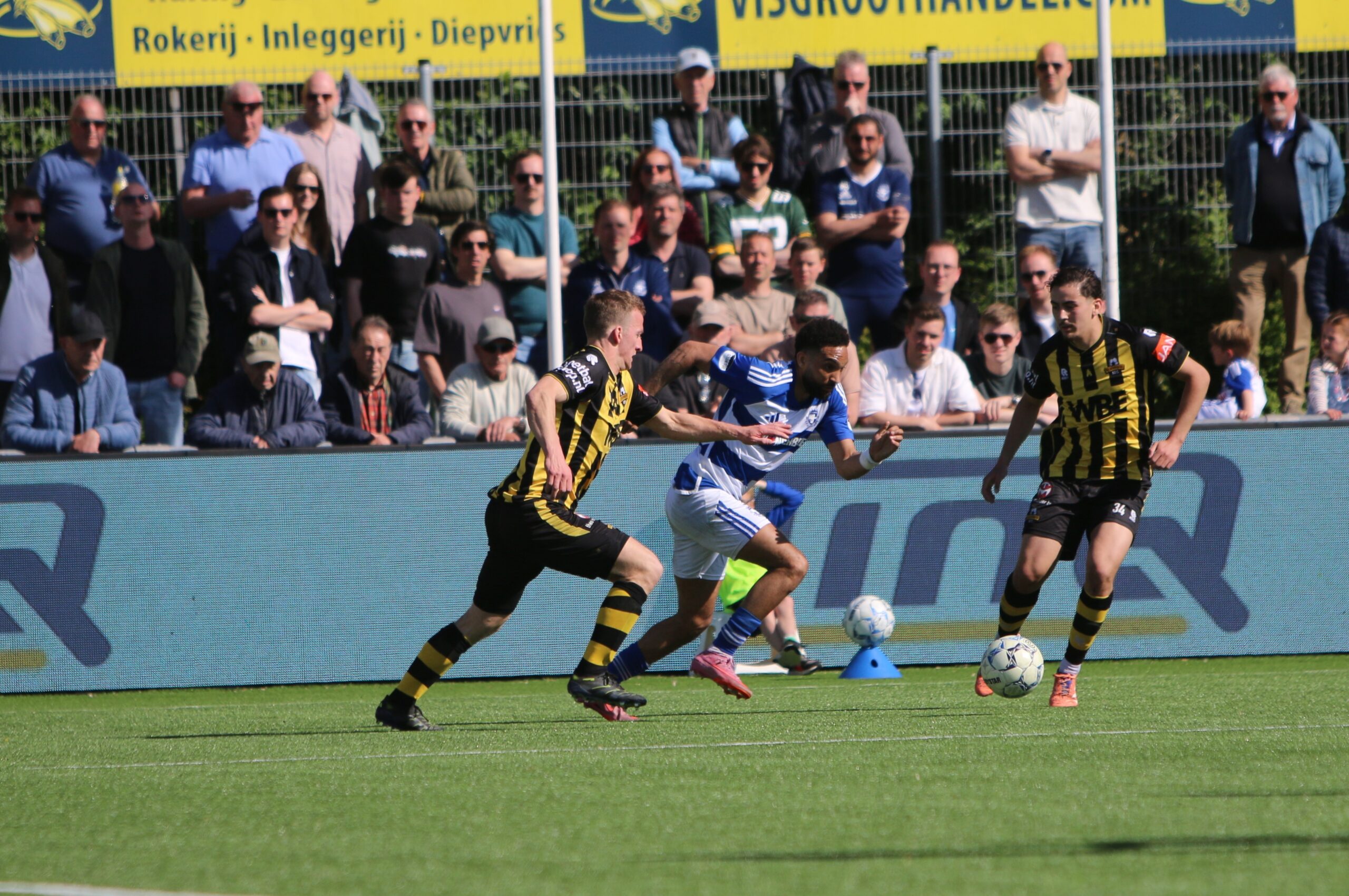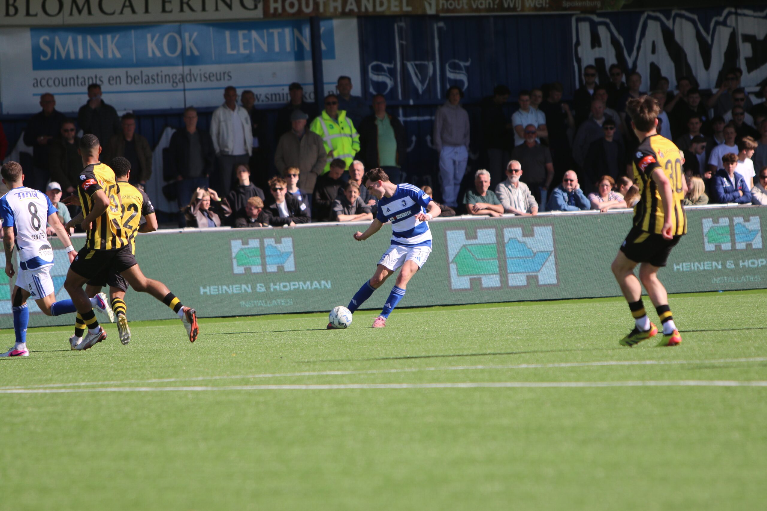 De wedstrijd begon met een lichte vertraging vanwege het opruimen van confetti op het veld, maar daarna ontspon zich al snel een levendig duel. In de openingsfase moest doelman Joey Houweling direct handelend optreden na een gevaarlijke tegenstoot. Onze Blauwen lieten zich echter eveneens gelden, met onder meer grote kansen voor Ravelino Junte en Ahmed El Azzouti, die naast schoot.