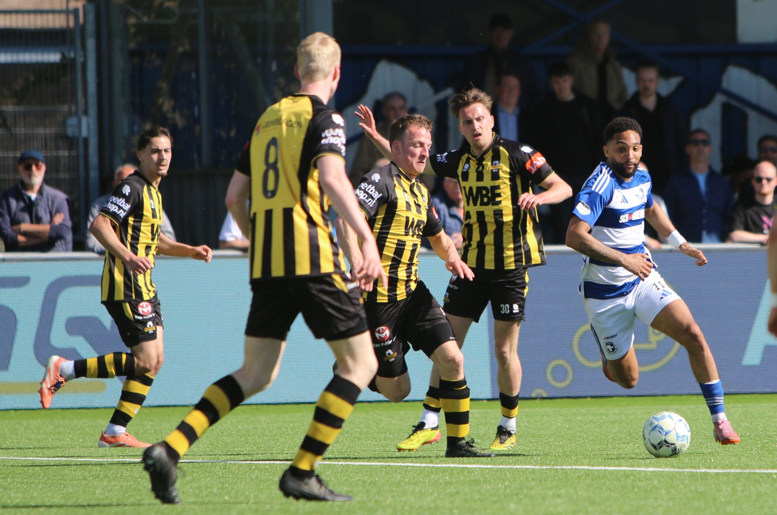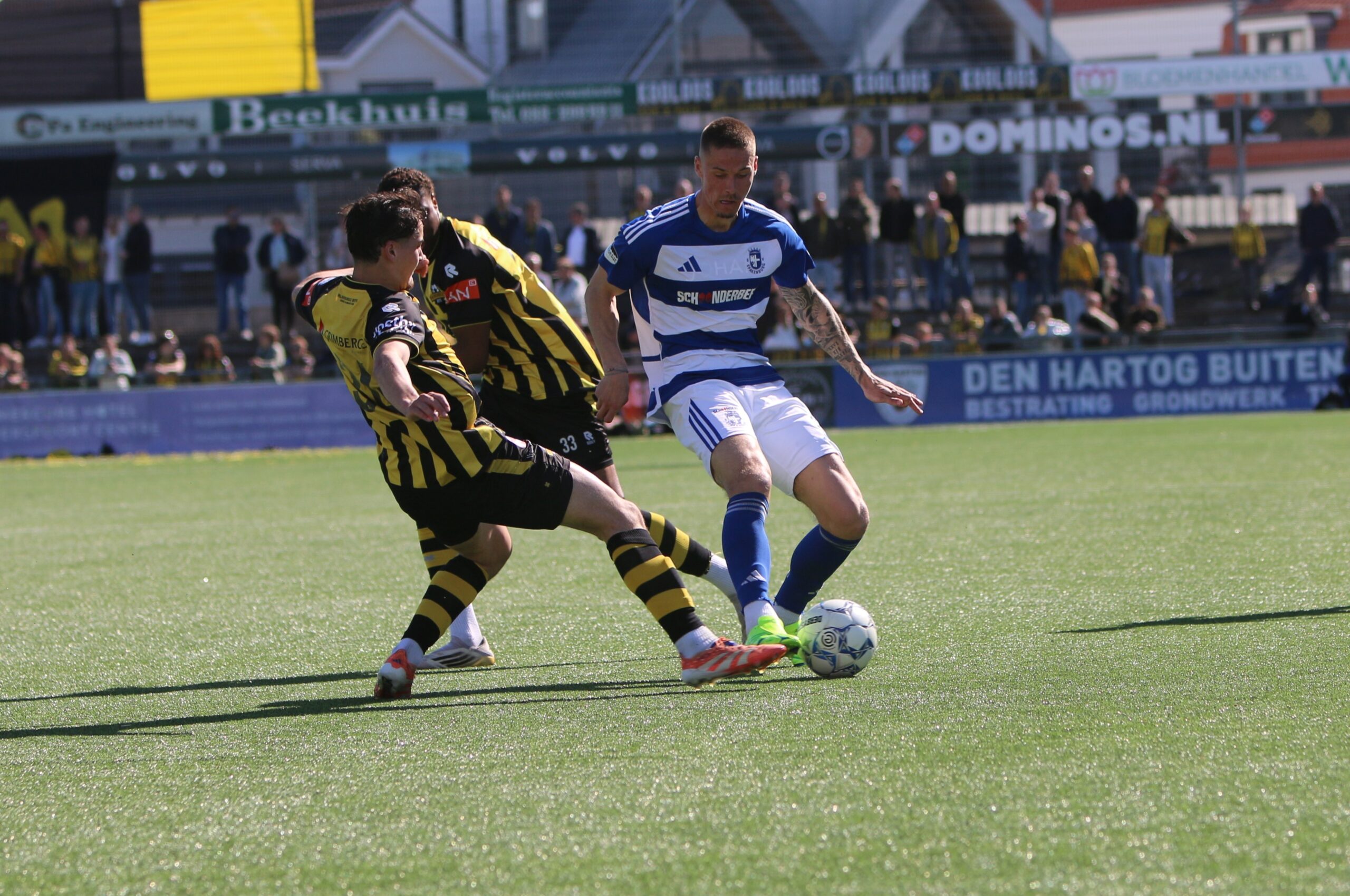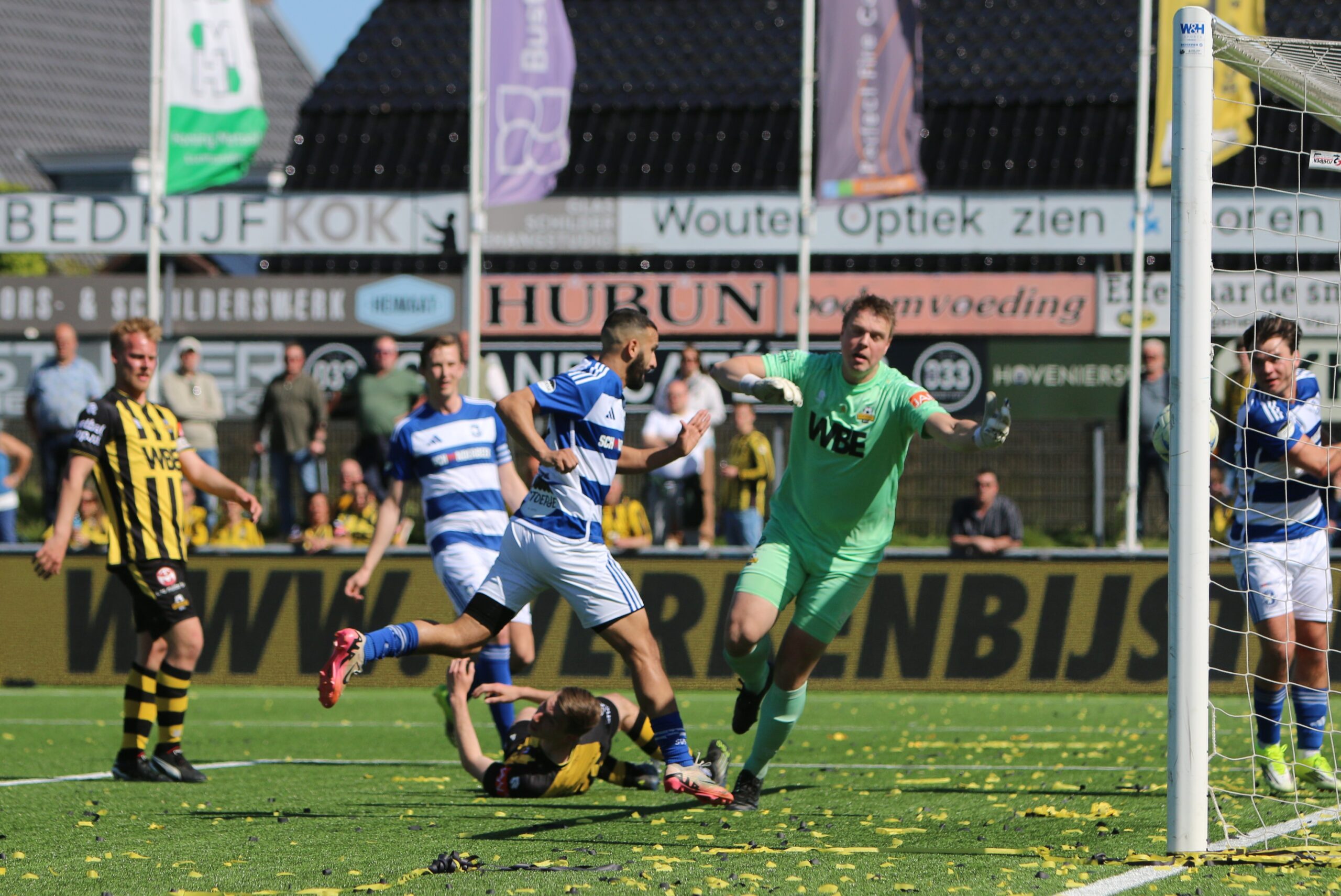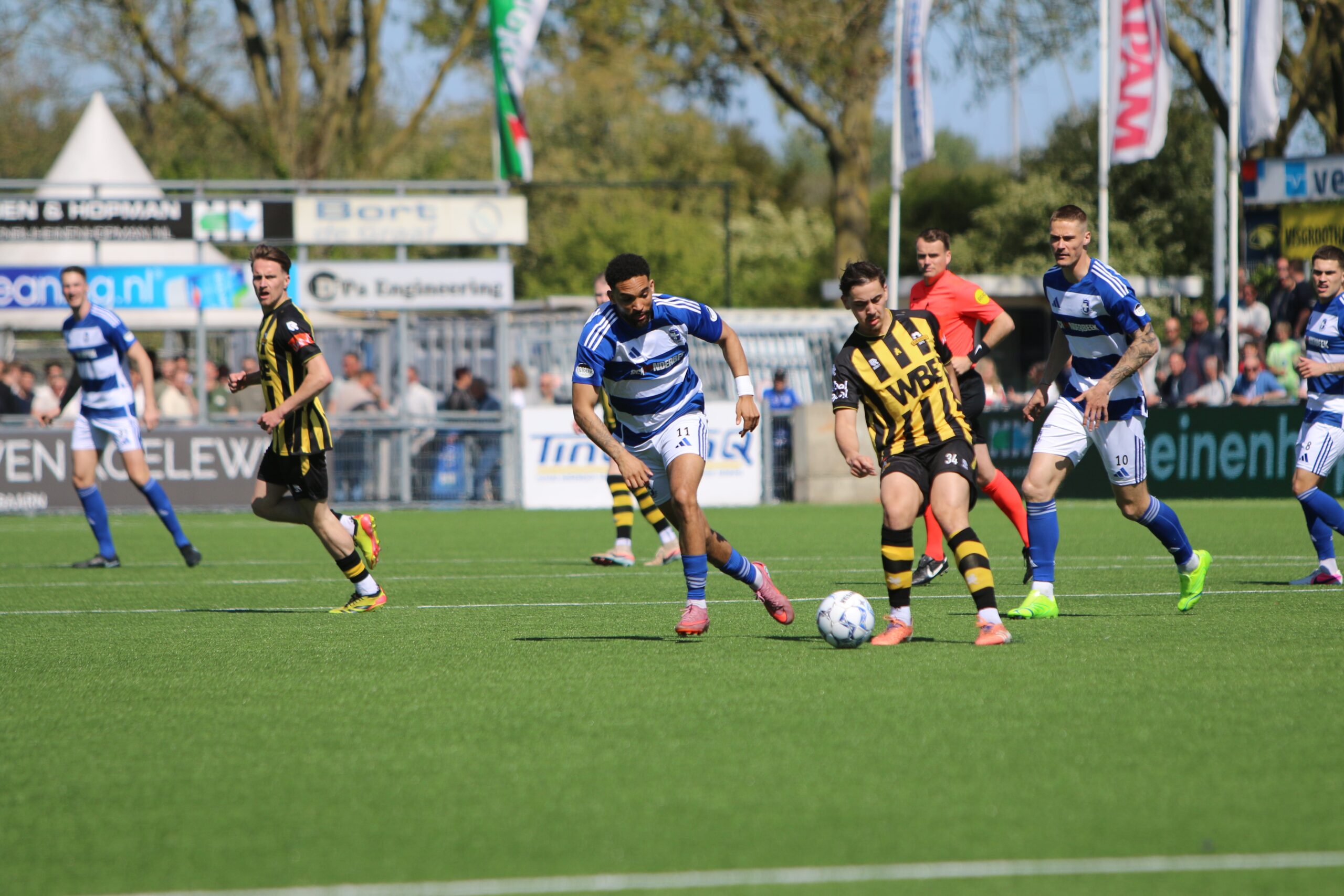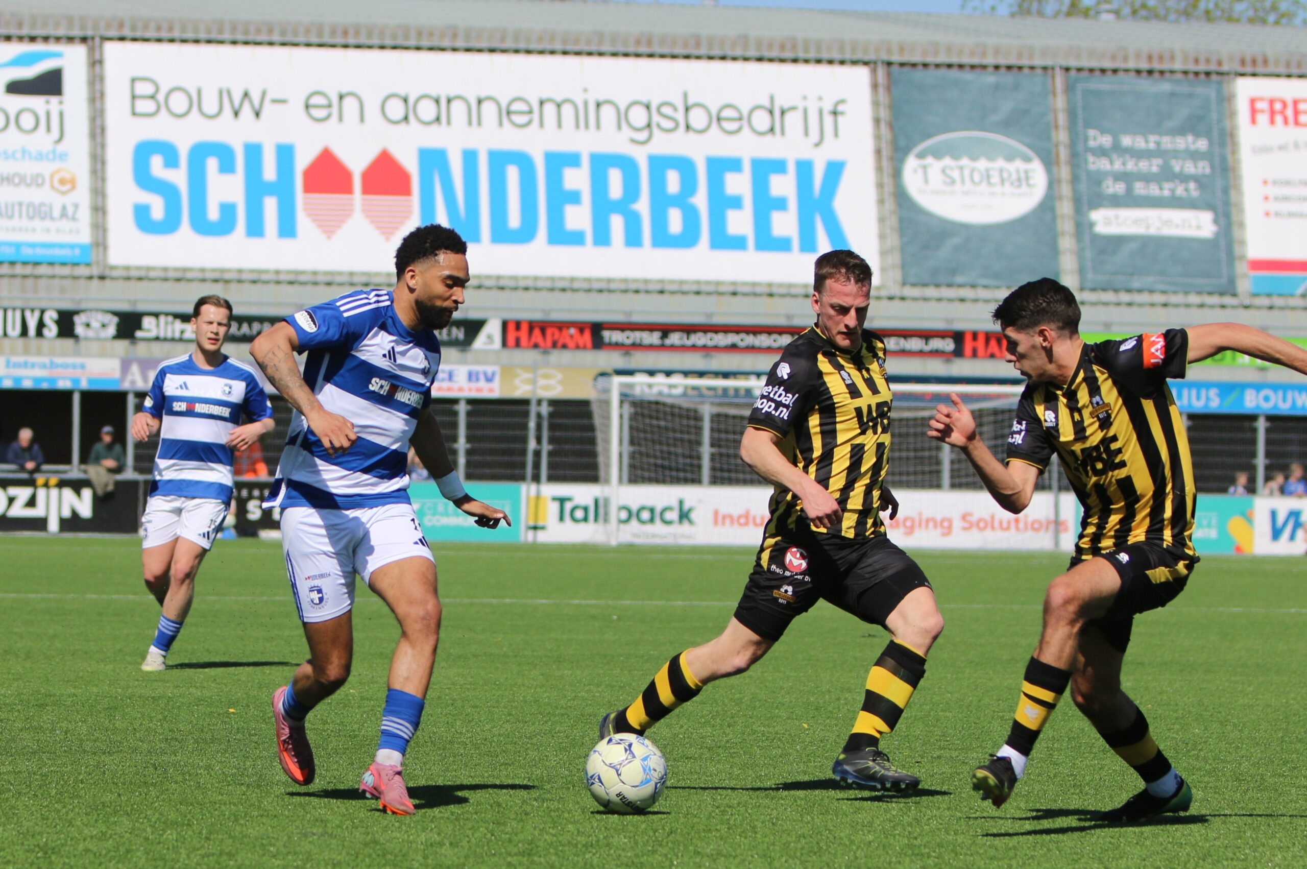 De wedstrijd begon met een lichte vertraging vanwege het opruimen van confetti op het veld, maar daarna ontspon zich al snel een levendig duel. In de openingsfase moest doelman Joey Houweling direct handelend optreden na een gevaarlijke tegenstoot. Onze Blauwen lieten zich echter eveneens gelden, met onder meer grote kansen voor Ravelino Junte en Ahmed El Azzouti, die naast schoot.