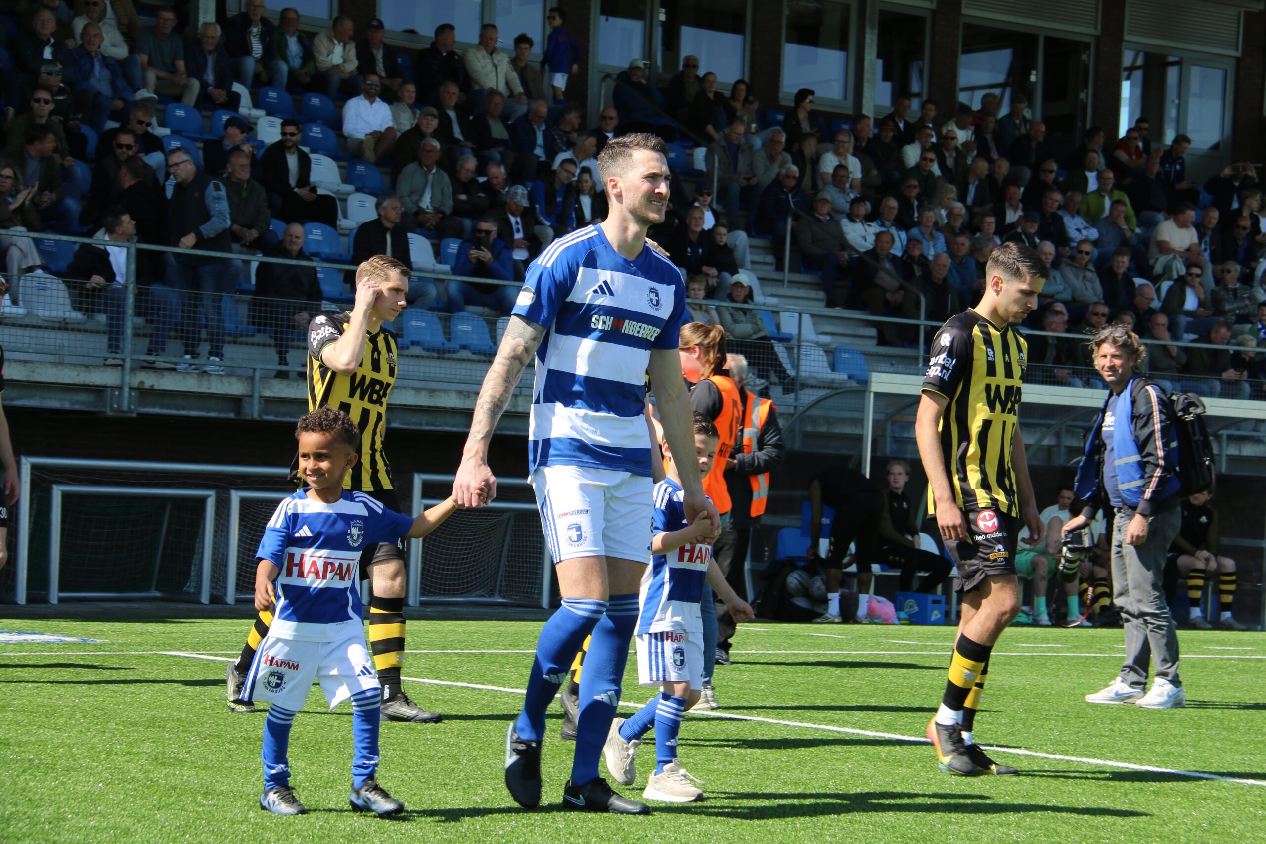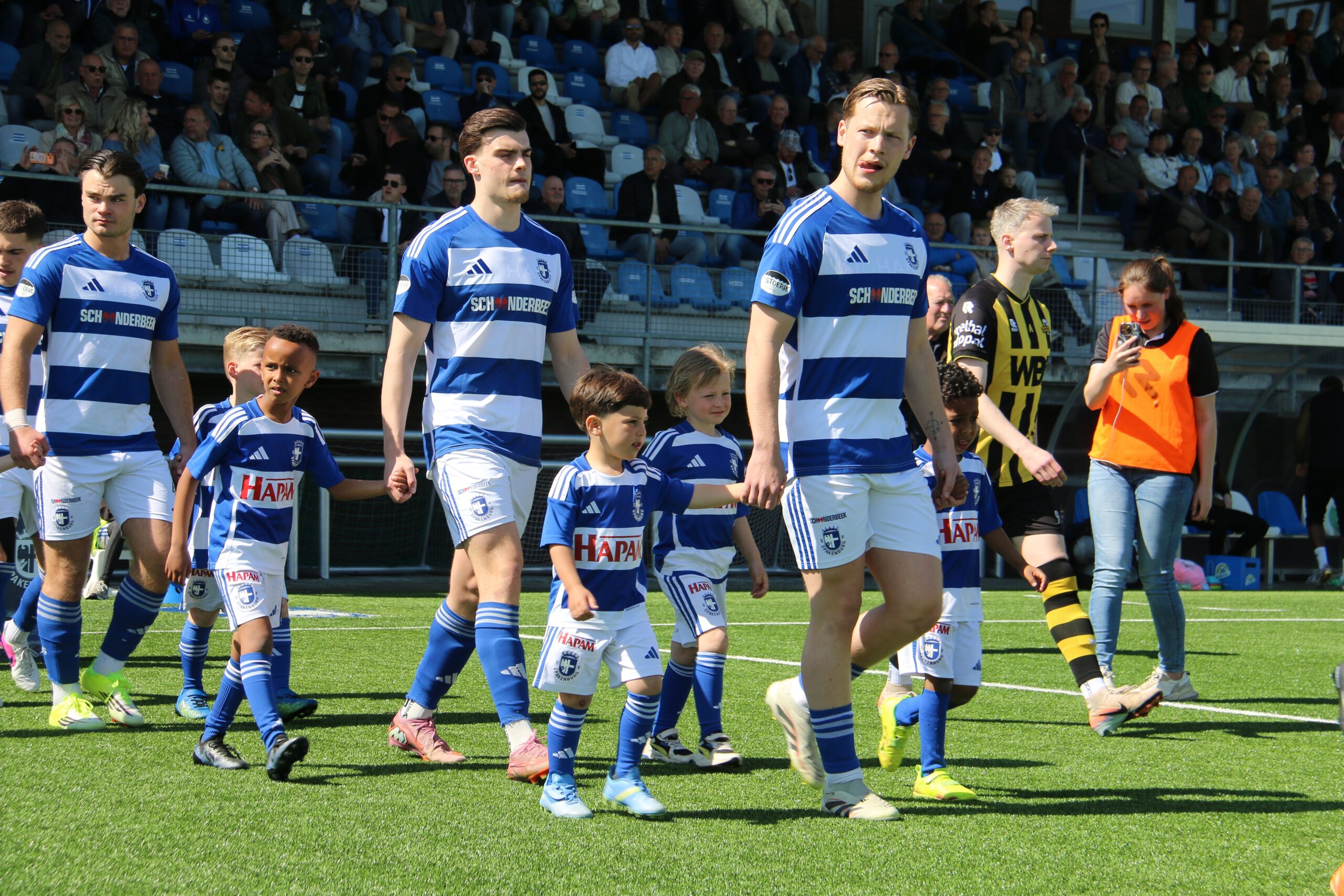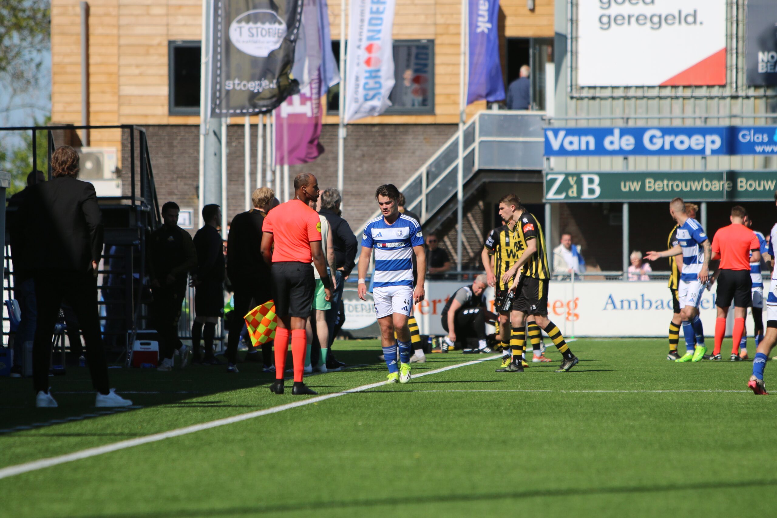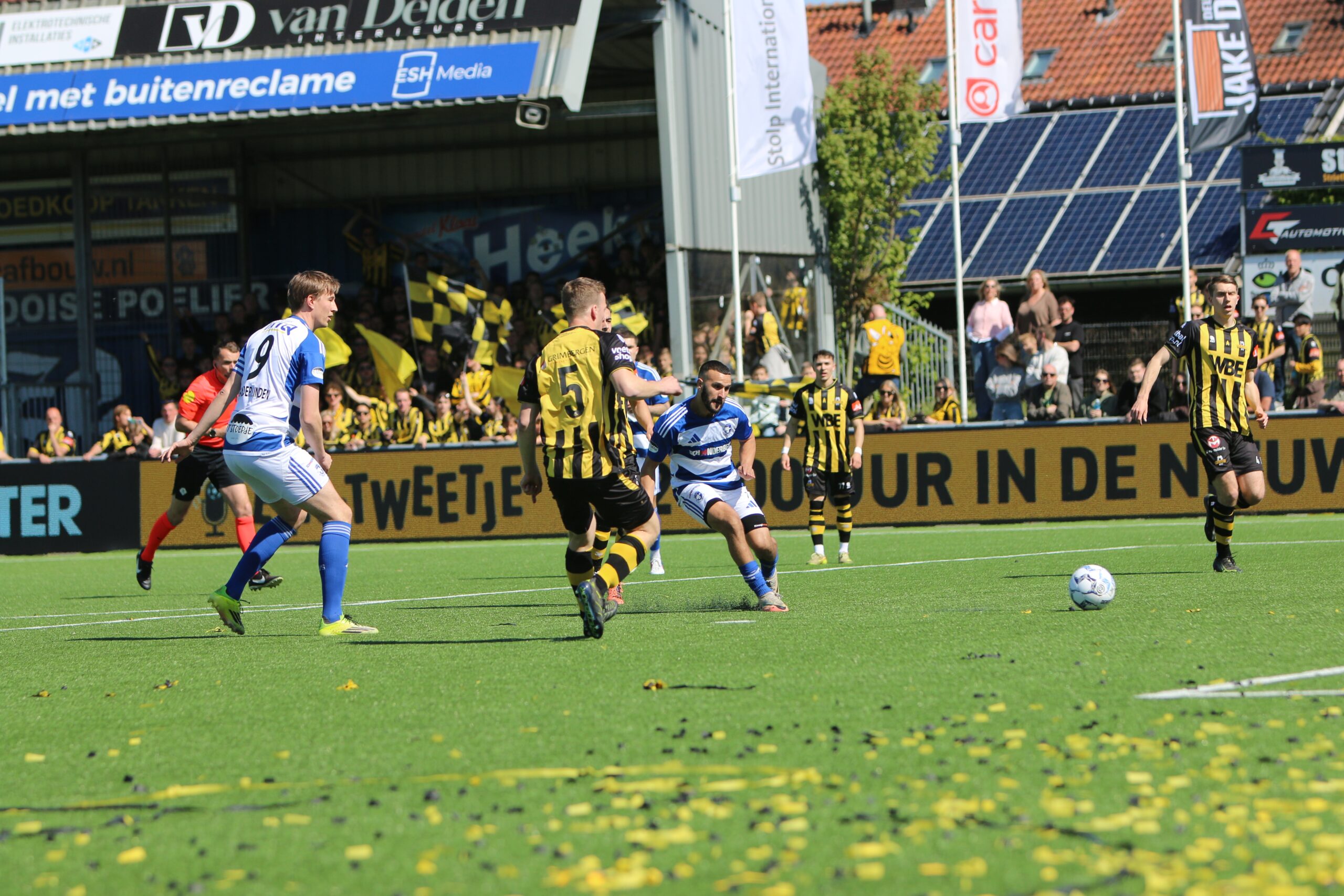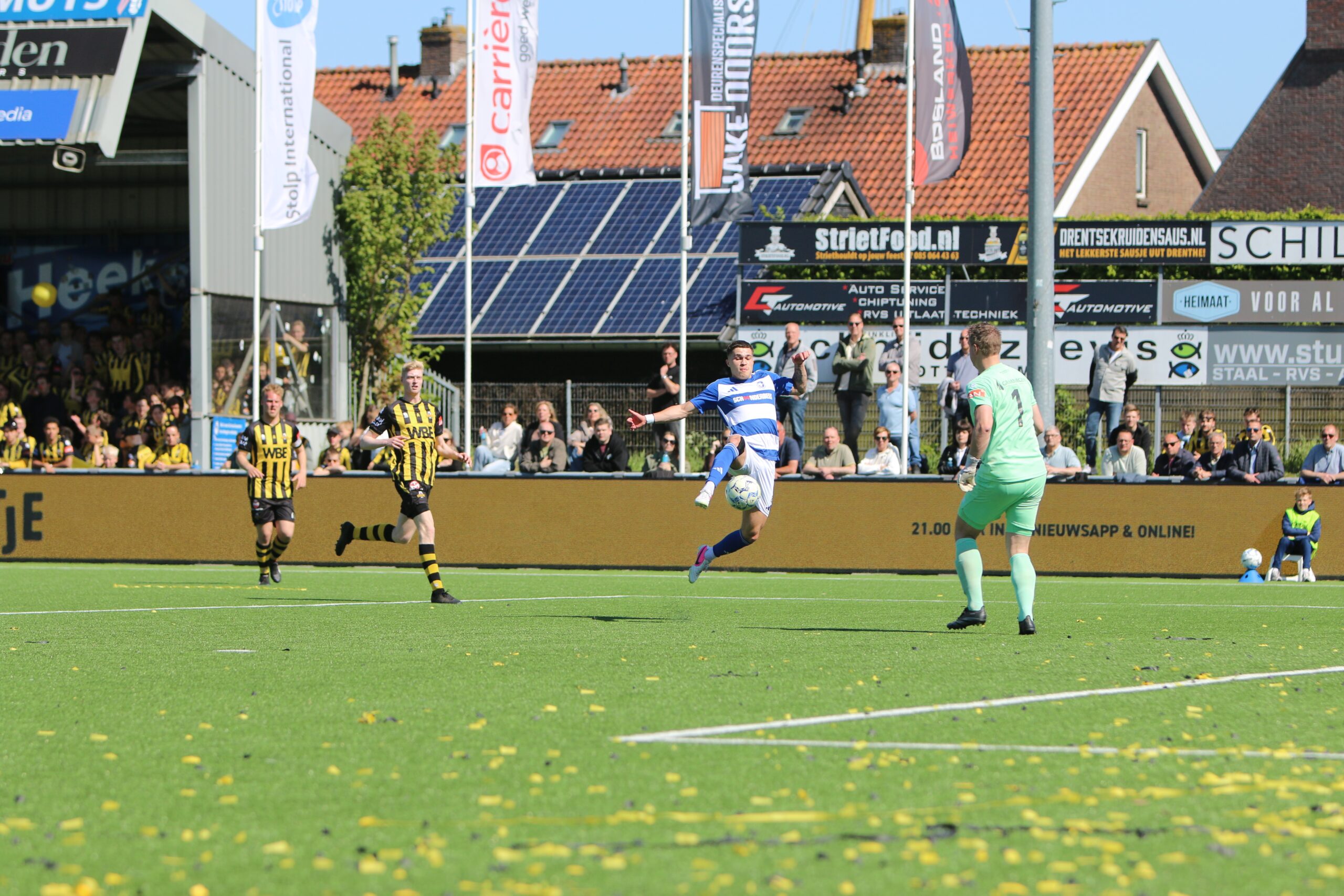 De wedstrijd begon met een lichte vertraging vanwege het opruimen van confetti op het veld, maar daarna ontspon zich al snel een levendig duel. In de openingsfase moest doelman Joey Houweling direct handelend optreden na een gevaarlijke tegenstoot. Onze Blauwen lieten zich echter eveneens gelden, met onder meer grote kansen voor Ravelino Junte en Ahmed El Azzouti, die naast schoot.